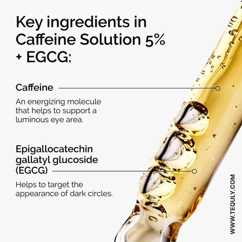 Caffeine Solution 5% + EGCG is an effective, water-based serum that targets dark circles and puffiness around the eyes, promoting under-eye brightening. Formulated with 5% caffeine and epigallocatechin gallatyl glucoside (EGCG), this potent serum helps improve the appearance of tired eyes while providing a brightening effect. Caffeine helps reduce puffiness, while EGCG helps reduce the appearance of dark circles.